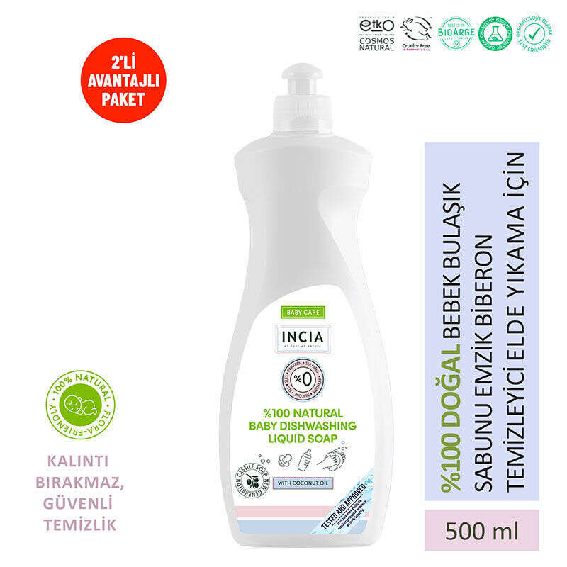 Incia Doğal Bebek Bulaşık Sabunu SLES/SLS, silikon, sentetik koku, sentetik boya, mineral yağ içermez.
