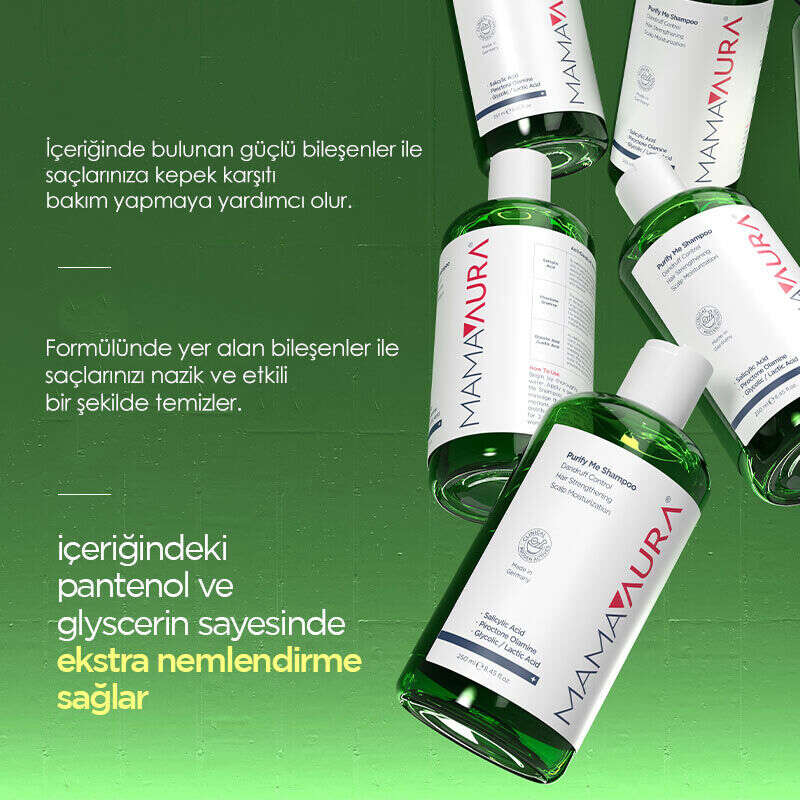 - Anında Kepek Karşıtı Etki: Mamaaura® Purify Me Şampuan'ın efektif formülasyonu, Salisilik Asit, Glikolik Asit, Laktik Asit ve Pirokton Olamin gibi etkili bileşenlerle desteklenmektedir.