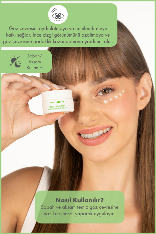 Maruderm Color Correcting Anti Aging Eye Cream; göz çevresine özel geliştirilmiş, anti-aging + color correcting (renk eşitleyici) etkili bir bakım kremidir.