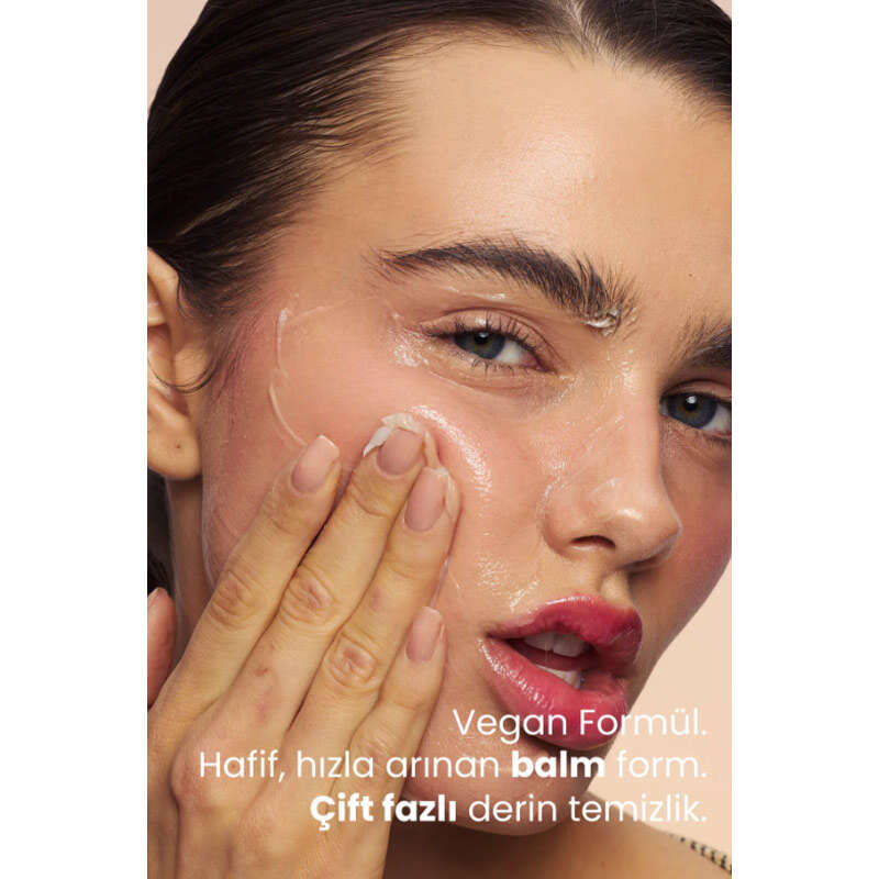 - Vegan formüle sahip hızlı arındırılan, yoğun nemlendirme ve besleme özellikli yüz temizleme balmı.