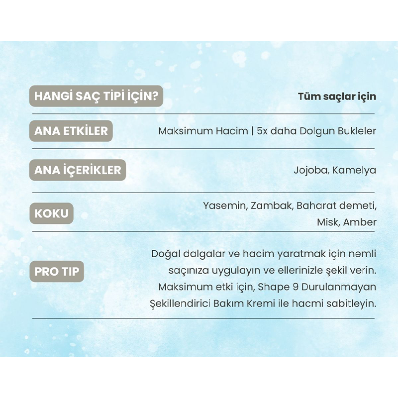 Nemli ve kuru saça uygulanabilen daha dolgun ve hacimli sonuçlar yaratan Deniz tuzlu hacim spreyi. Biotin ve Ginseng, saçın optimal nem seviyesini korumaya yardımcı olur. Uygun Saç Tipi: