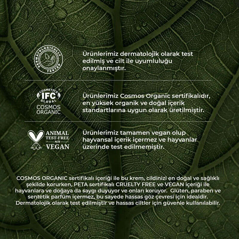 Organik içeriklerden elde edilen formüle sahip aydınlayıcı ve yaşlanma karşıtı göz çevresi bakım kremi