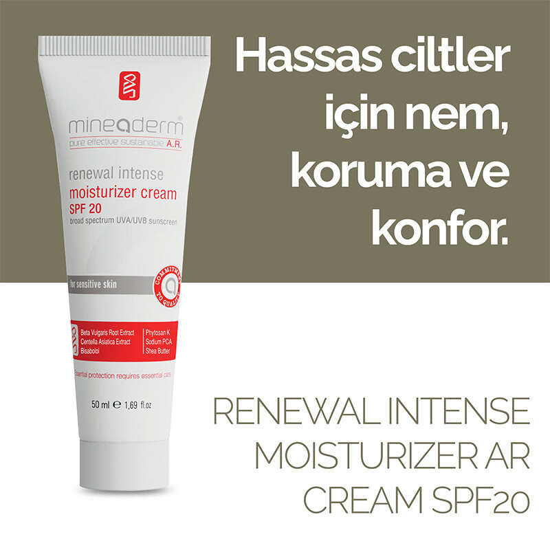 - Renewal Intense Moisturizer Cream SPF 20, hassas cildinizi UV ışınlarına karşı korur ve direncini artırmaya yardımcı olur.