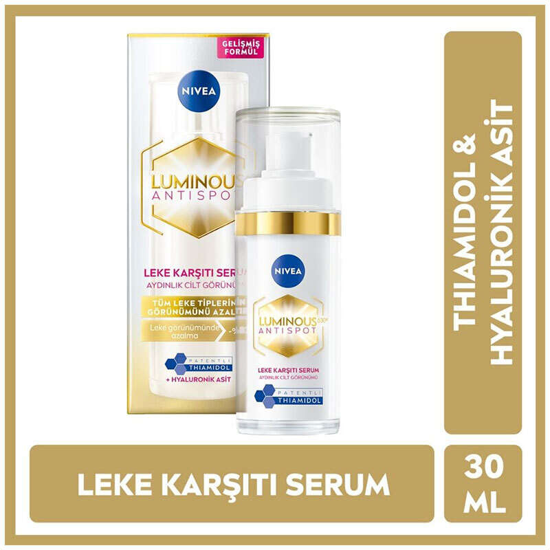 • NIVEA Luminous630 Leke Karşıtı Cilt Serumu 30ml: Patentli Thiamidol ile ilk günden itibaren koyu leke görünümüne karşı bakım yapar.