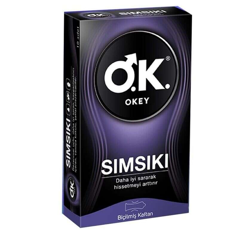 Okey Sımsıkı Rezervuar uçlu, çapı azaltılarak daha iyi saran ve hissetmeyi arttıran yapılı, kayganlaştırıcı içeren, şeffaf prezervatiftir.