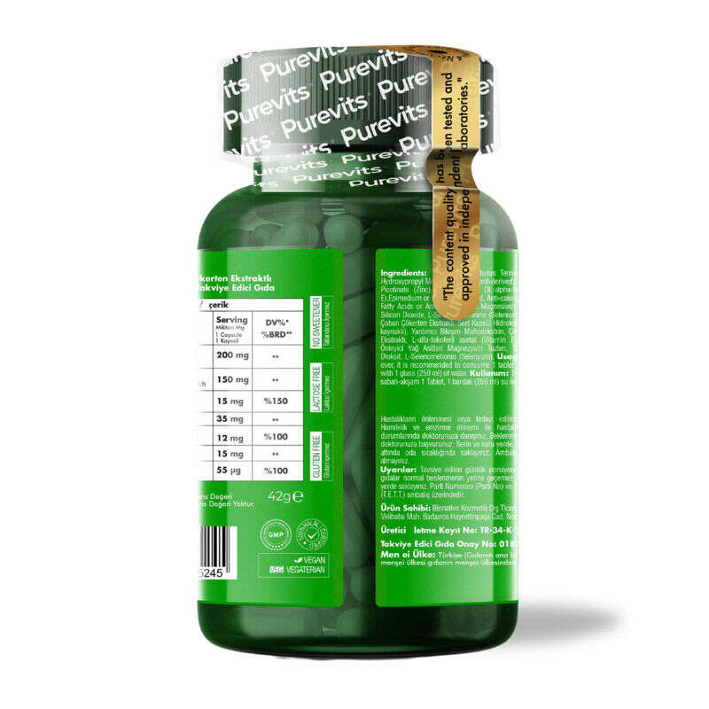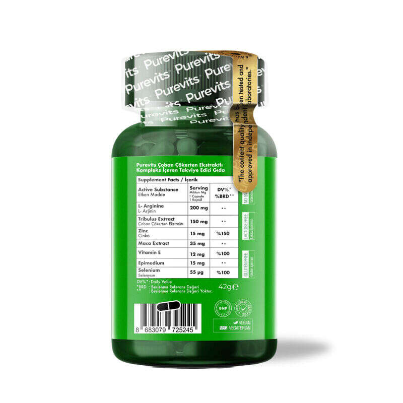 - Erkeklerin ihtiyaçları için özel olarak formülize edilen Purevits Tribulus For Men Complex, L-Arginine (L- Arjinin), Tribulus Extract (Demir Dikeni Ekstraktı), Zinc (Çinko), Maca Extract, Vitamin E, Epimedium ve Selenium (Selenyum) içeren besin takviyesidir.