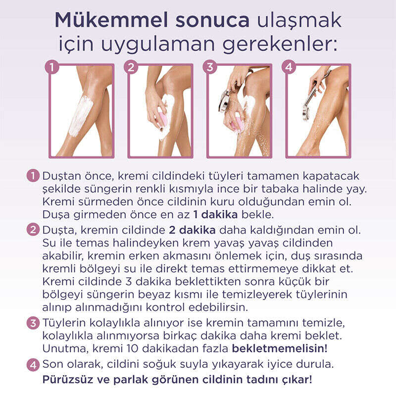 Tüylerin kolaylıkla alınıyor ise kremin tamamını temizle, kolaylıkla alınmıyorsa birkaç dakika daha kremi beklet.