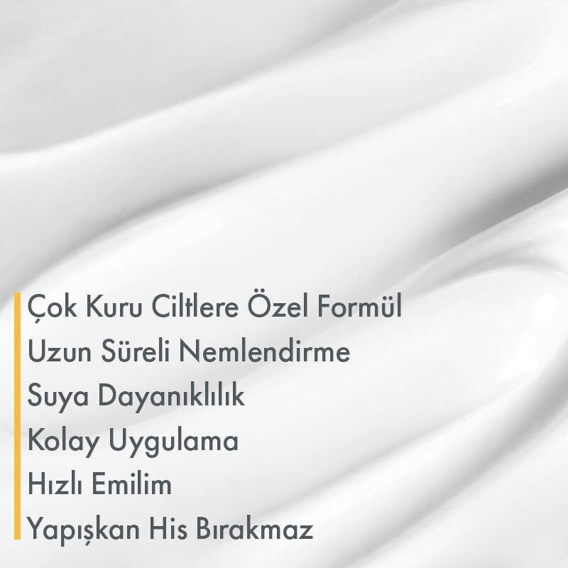 Kuru ve çok kuru ciltler için özel olarak geliştirilen formülü, cildin kaybettiği nemi geri kazandırmaya yardımcı olur; cildi UVA ve UVB ışınlarına karşı korur.