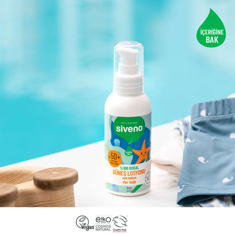 Siveno %100 Doğal Çocuklar için Güneş Losyonu, çocukların hassas cildini güneşin zararlı ışınlarına karşı korur.