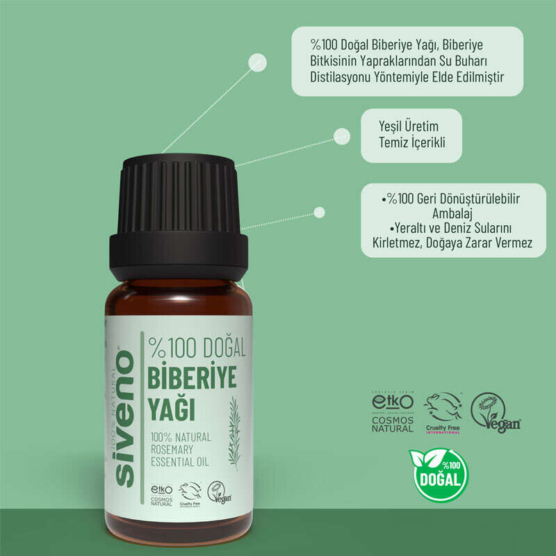 Siveno Doğal Biberiye yağı, biberiye bitkisinin (Rosmarinus officinalis) yapraklarından elde edilen uçucu bir yağdır. Siveno %100 Doğal Biberiye yağı, bitkinin yapraklarının su buharı distilasyonu yöntemiyle elde edilir ve oldukça yoğun, aromatik bir kokuya sahiptir. Böylelikle en iyi etkinlik için maksimum besin ve etkili bileşenler korunmuş olur.