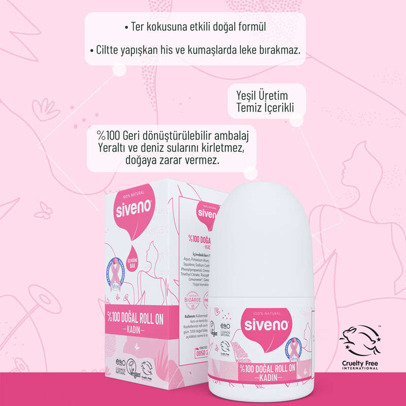 Siveno Roll-On Kadın tamamen doğal bir mineral tuz olan potasyum alum içermektedir..