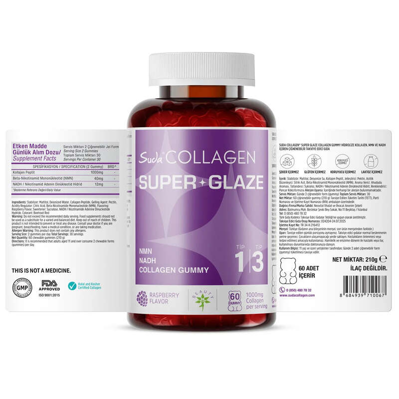 Suda Collagen Super Glaze Tip I-III Kolajen + NMN + NADH 60 Adet Gummy