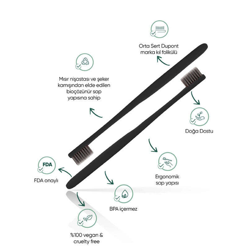 Bu diş fırçası biyolojik olarak parçalanabilir özellik gösterir. Kullanım süresi sona erdiğinde, sadece doğal çevreye bırakmanız yeterlidir. Böylece dünya üzerinde bir plastik atık izi bırakmazsınız. Diş fırçanız güvenle atabilir ve doğal döngüsüne geri dönmesine yardımcı olabilirsiniz.