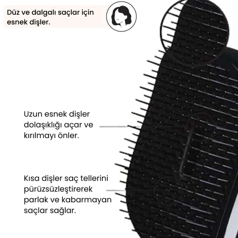 İngiltere'de son teknoloji ile 2 farklı boyda dişli olarak üretilmiştir.Uzun dişler saçın elektriklenmemesine yardımcı olurken, kısa dişler saçınızın yumuşak ve parlak görüntü edinmesini sağlar.
