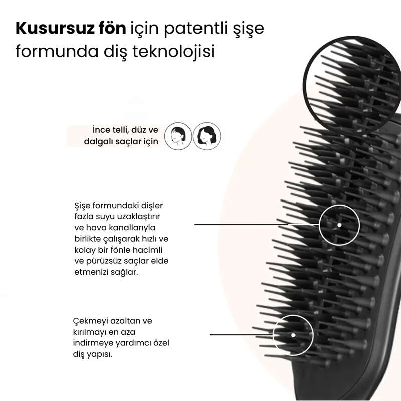 Patentli diş teknolojisi ve taraktaki özel delikler, sıcak havanın geçmesini sağlayarak kuruma süresini kısaltır.