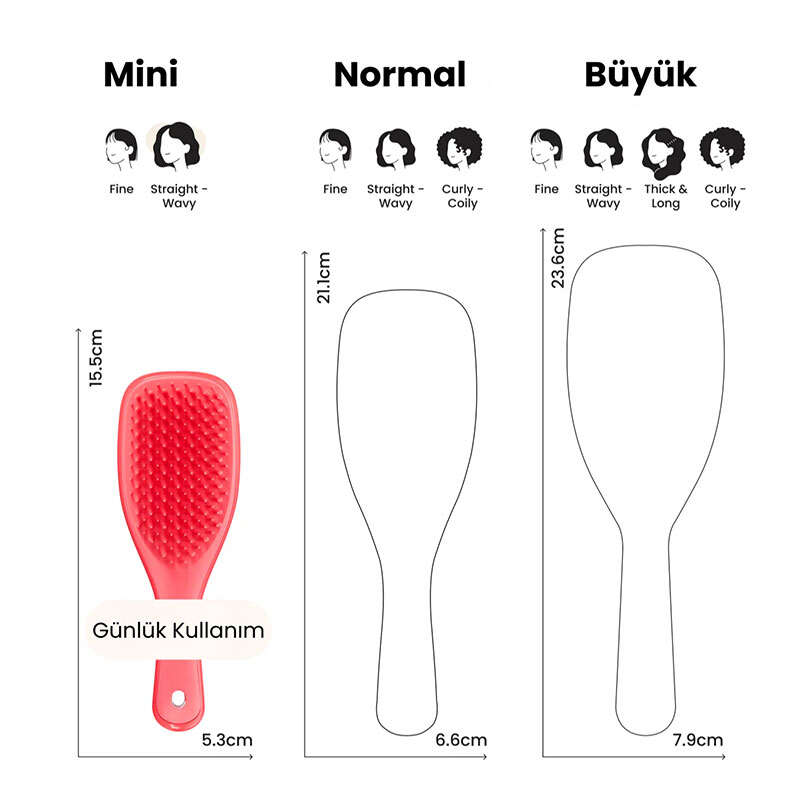Uzun, esnek dişler çözülür, düğümleri giderir ve kırılmaları azaltır, kısa dişler ise parlak, elektriklenmeyen saçlar için pürüzsüzdür.