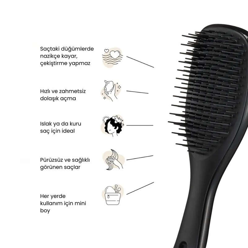 Kısa boyuna aldanmayın, bu saç fırçası hem ıslak hem de kuru saçları rahatlıkla açar. Esnek dişleri saç kırılmalarını azaltır.