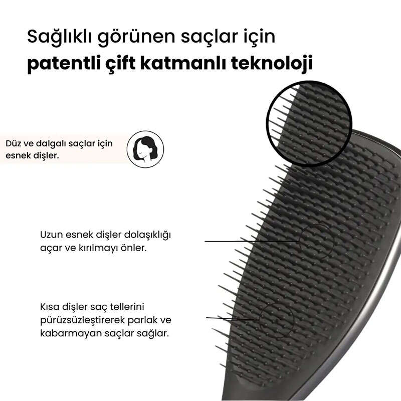 Patentli iki katmanlı diş teknolojisi, duş sonrası hassaslaşan saçlara karşı son derece naziktir; daha az kırılma, daha fazla o “parmaklarınızı saçlarınızdan geçiriyormuş” hissi sunar.