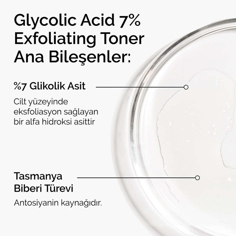 Cildi pürüzsüzleştirmeye, daha eşit bir cilt tonu ve aydınlık bir görünüm sağlamaya yardımcı, günlük kullanıma uygun glikolik asit tonik. %7 Glikolik Asit Arındırıcı Tonik, cilde güçlü bir eksfoliasyon sunmak için bir alfa hidroksi asit (AHA) olan %7 glikolik asit ile formüle edilmiş su bazlı bir eksfoliasyon toniğidir.