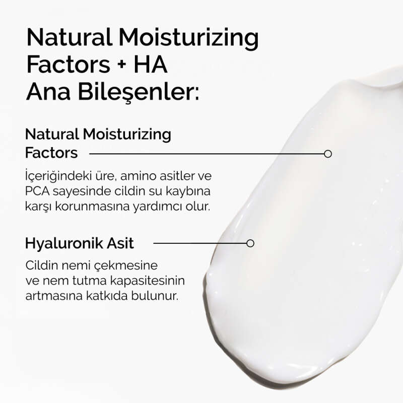 Doğal Nemlendirici Faktörler + HA, cildin doğal nemlendirme sisteminin bileşimini taklit edecek şekilde tasarlanmış etkili bir nemlendiricidir.