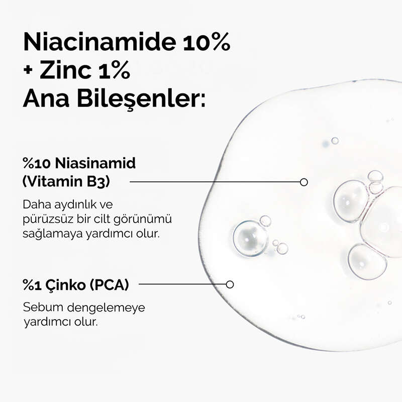 Niasinamid (B3 vitamini) ve Çinko PCA içeren formülüyle cildin pürüzüsüz görünmesini hedefler.