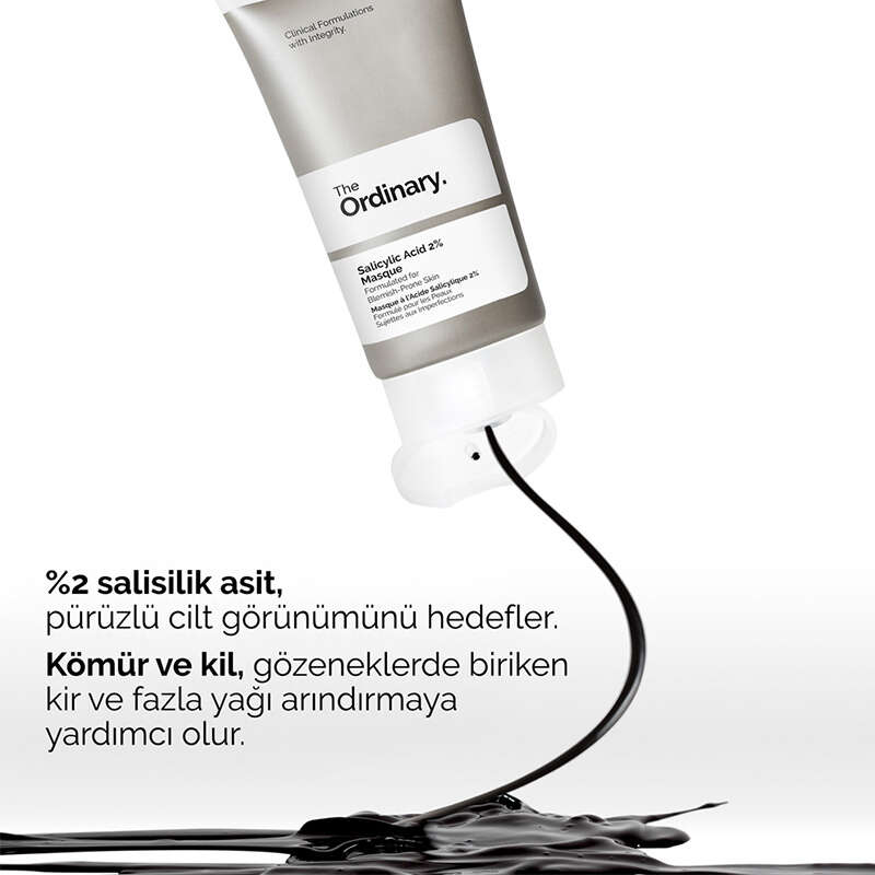 %2 Salisilik Asit Maskesi, kömür ve kil içeren formülü sayesinde canlı ve pürüzsüz cilt görünümünü hedefler.