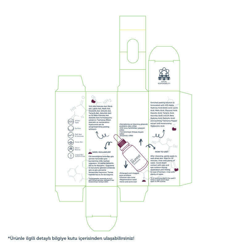 Ürün Faydaları: Cilt tonu farklılıklarının dengelenmesine yardımcı olur. Nemlendirici Hyaluronik asit ile zenginleştirilmiş peeling solüsyon. Düşük pH özelliği nedeniyle hassas ciltlerin kullanımı önerilmez. Cildin pürüzsüz, yumuşak ve nemli bir görünüm kazanmasına katkı sağlar.