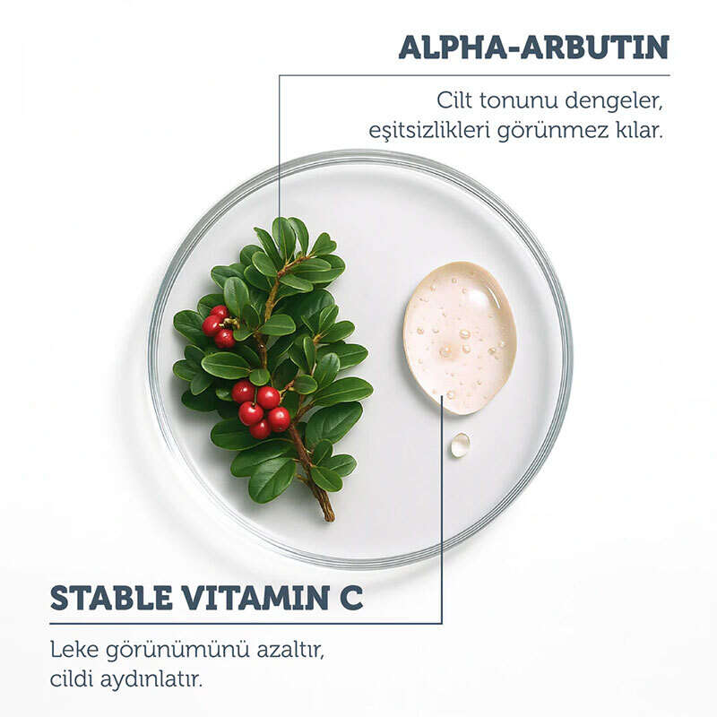 Stabil C vitamini ve Alpha-Arbutin ile mevcut lekelerin görünümünü azaltır ve cilt tonunu eşitlemeye yardımcı olur.