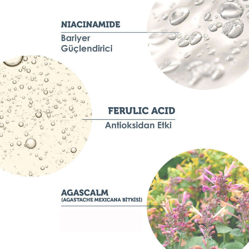 Yenilikçi formül Panthenol, Tokoferol ve 4D Hyaluronic Asit ile aynı zamanda cildin nem dengesini sağlar.