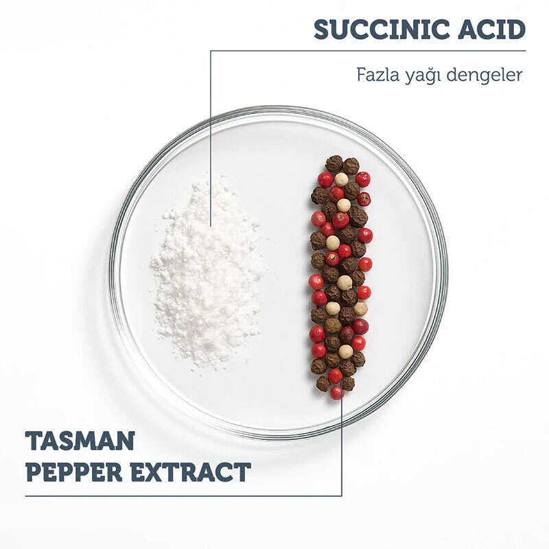 Süksinik asit ve Tazman Pepper ekstraktı ile sebumun dengelenmesinde yardımcı olurken parlama karşıtı bakım sağlar.