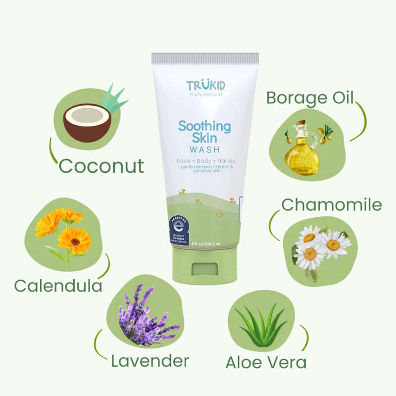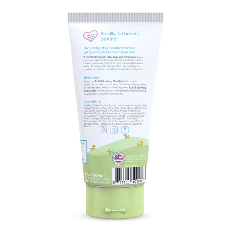 Purified water, sodium cocoyl isethionate (coconut), oleyl betaine (palm), aloe barbadensis leaf juice (aloe vera), extracts of calendula, chamomile, lavender, decyl glucoside (plant), borage oil, panthenol (pro-vitamin B-5), citric acid, sodium benzoate (salt of benzoic acid), potassium sorbate, ethylhexylglycerin (plant)