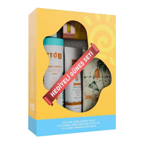 Güneş Losyonu 100ml +Güneş koruyucu stick 20 gr + Güneş sonrası losyon 200 ml + Plaj ÇantasıTTO Clinic Güneş Losyonu 100 ml