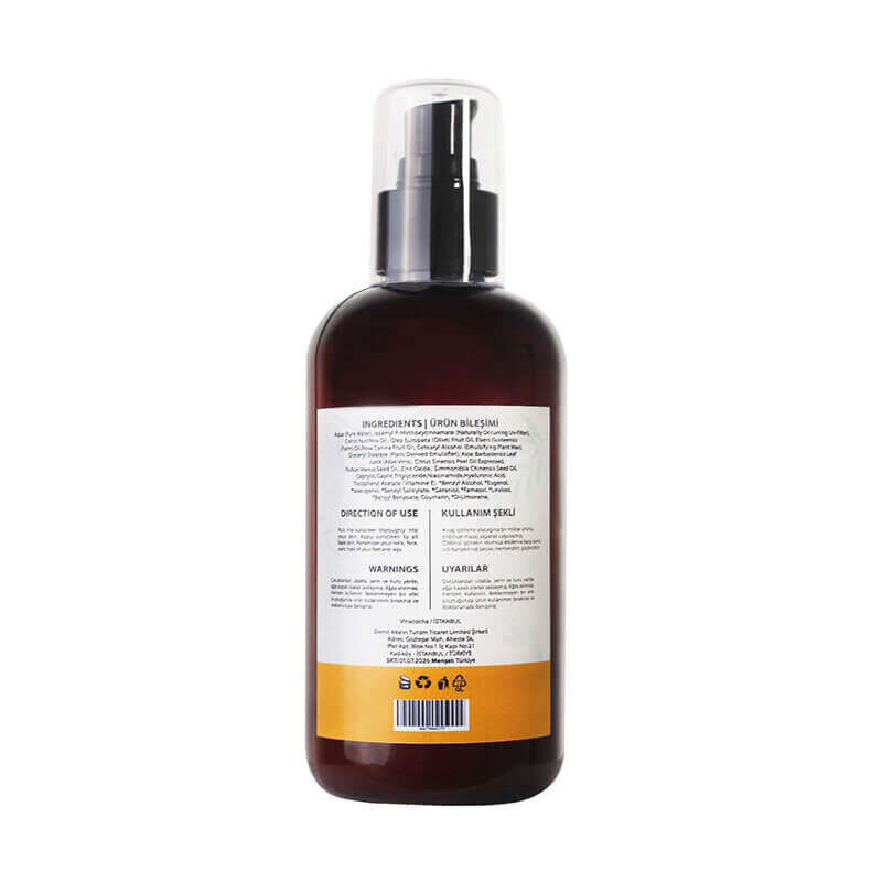 Güneşin Ultraviyole ışınlarından korumada en etkili bitkisel yağ olan soğuk sıkım Hindistan Cevizi Yağı, Kuşburnu Çekirdeği Yağı, Aloe vera ve Portakal uçucu yağı ile formül edilmiştir.İçeriğindeki doğal yağlarla kadifemsi, pürüzsüz,canlı bir görüntü oluşturur.