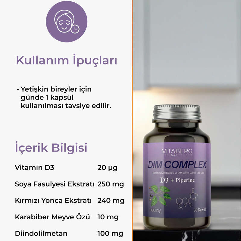 Vitaberg Dim Complex 30 Kapsül – DIM 100 mg, D3 ve Bitkisel Ekstreler İçeren Takviye Edici Gıda