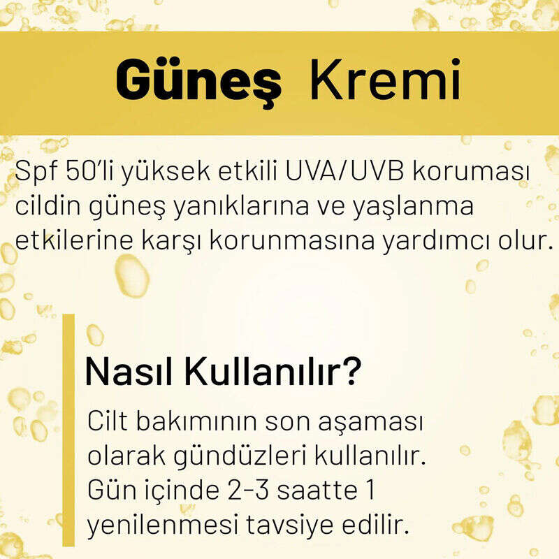 50+ SPF özelliği ile güneşin zararlı UVA ışınlarına karşı uzun süreli koruma sunan bu güneş kremi, her cilt tipine uygun olarak tasarlanmıştır ve güneşe maruz kaldığınız her anınızda güvenilir bir koruma sağlar.