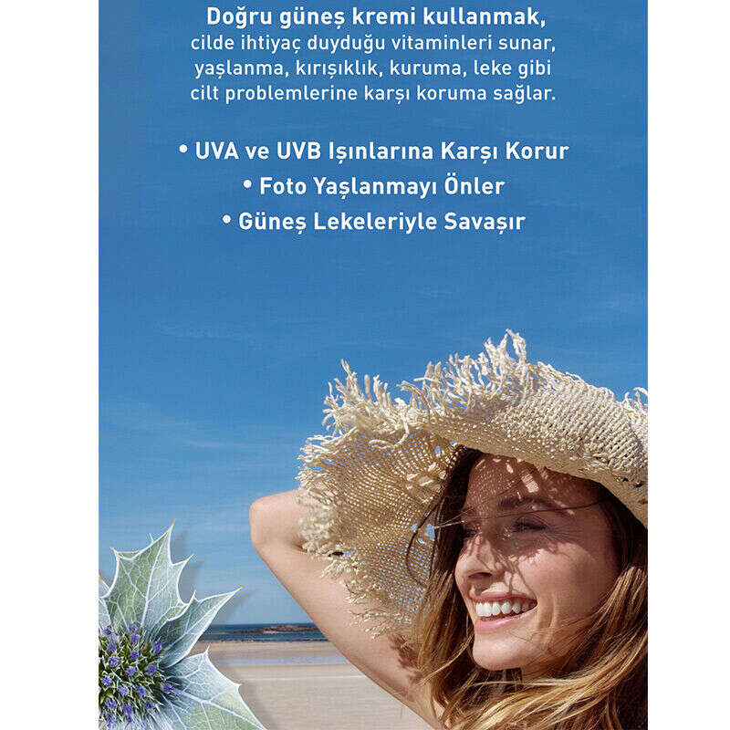 - 50 koruma faktörlü güneş kremi, cildinizi UVA/UVB ışınlarına karşı yüksek oranda korunmasına rağmen ince dokusu sayesinde cildinizde hissetmezsiniz.