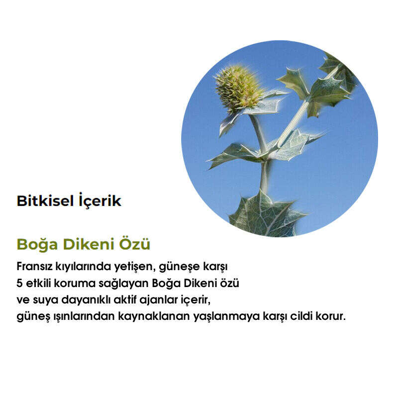 - Boğa Dikeni’nin 5 etkisi: melanin üretimini artırır, UVA ve UVB’ye karşı cildin kendini koruma mekanizmasını güçlendirir, güneş ışınlarından kaynaklanan yaşlanmaya karşı korur.